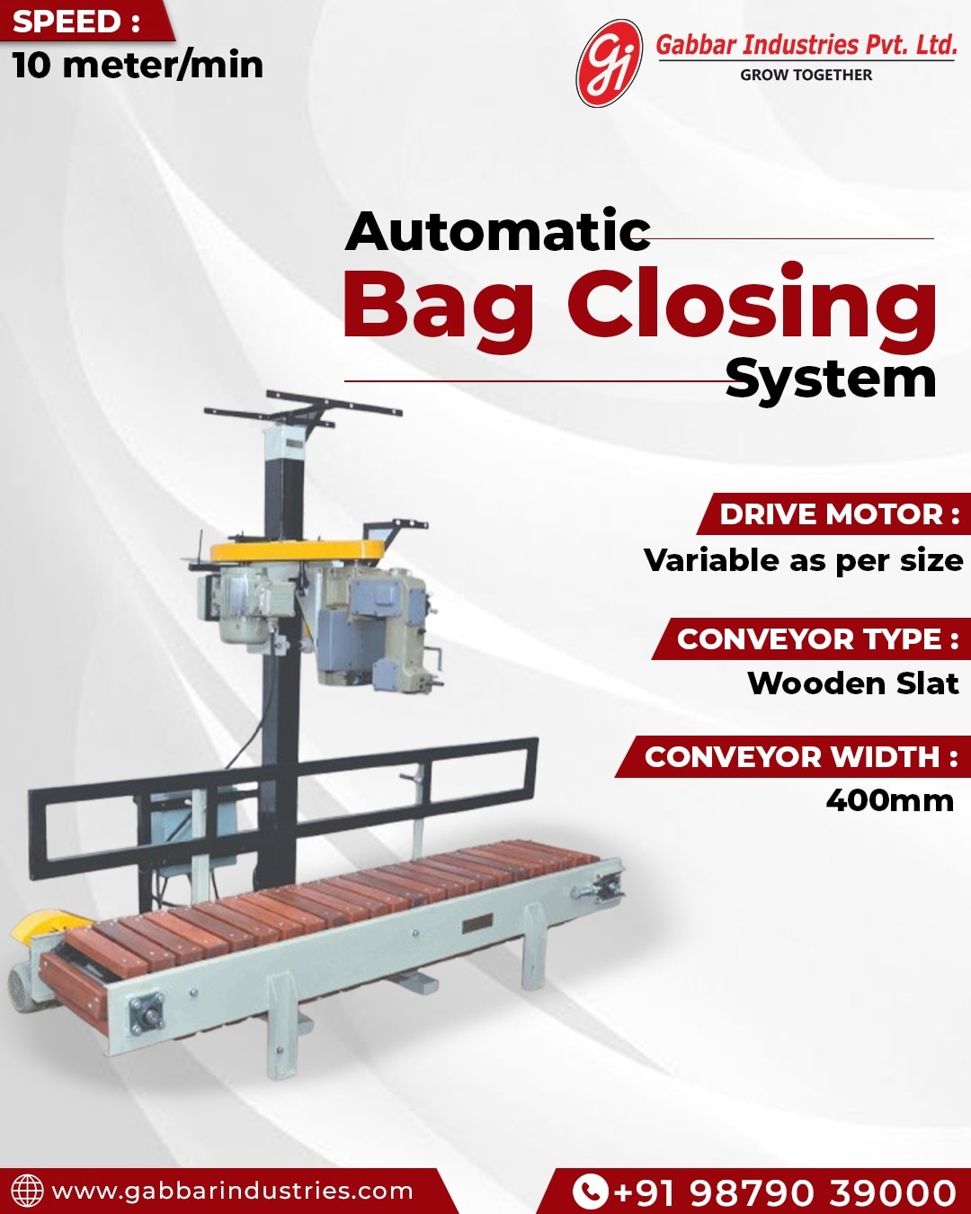 Best Automatic Bag Closing System Manufacturer in India. At Gabbar Industries Pvt Ltd, we believe in delivering machinery that simplifies operations while ensuring consistent performance. Our Automatic Bag Closing System is designed to handle the demanding needs of packaging industries with speed, precision, and durability. Whether you’re sealing bags of fertilizer, rice, sugar, or animal feed, this system ensures professional-grade results every time. Technical Specifications Main Features: • Suitable for fertilizer, sugar, rice, flour, poultry feed, powder milk and more • Sturdy design with simple operation for sealing filled bags • Main housing sealed to resist dirt and particles • Adjustable stitching width: 5mm to 9mm • Works with HDPE/PP/Jute/Polyjute/Hessian & Craft thread bags Wooden Conveyor Specifications: • Speed: 10 m/min • Drive Motor: Variable as per size • Conveyor Type: Wooden Slat • Height: 350mm • Width: 400mm • Length: 2–10 meters Belt Conveyor Specifications: • Speed: 10 m/min • Drive Motor: Variable as per size • Conveyor Type: Green PVC / Black Checker Belt • Height: 350mm • Width: 400mm • Length: 2–10 meters Where Can It Be Used? The Automatic Bag Closing System is ideal for industries where bulk packaging is routine. Common applications include: • Fertilizer plants sealing large sacks • Sugar and rice mills handling high volumes daily • Flour mills ensuring clean, consistent bag sealing • Poultry feed manufacturers managing bulk feed bags • Dairy and food processing units packaging powdered milk and similar products Its versatility makes it a go-to solution across agriculture, food, and chemical sectors. Tested Performance That Delivers Every Automatic Bag Closing System we manufacture undergoes strict quality checks to guarantee performance under real-world industrial conditions. From dust-laden flour mills to moisture-prone fertilizer plants, its sealed housing protects the motor from dirt, particles, and harsh environments. The adjustable stitching width (5mm–9mm) allows versatility for different packaging requirements, ensuring a neat, strong seal with every operation. Built for Industry Professionals Engineered with a sturdy design and user-friendly controls, this system is built for professionals who value reliability. Its variable speed pulley synchronizes perfectly with existing conveyors, making it adaptable without complex modifications. Designed to stitch HDPE, PP, jute, hessian, polyjute, or craft thread bags, it offers unmatched flexibility for different industries. Your Partner in Packaging Efficiency Choosing Gabbar Industries Pvt Ltd means choosing a partner who understands industrial challenges. Our Automatic Bag Closing System is not just a machine—it’s an investment in efficiency, consistency, and peace of mind for your operations. Call to Action Looking for a reliable solution to speed up your packaging line? Upgrade to the Automatic Bag Closing System from Gabbar Industries Pvt Ltd. Get in touch today and secure efficiency that lasts!